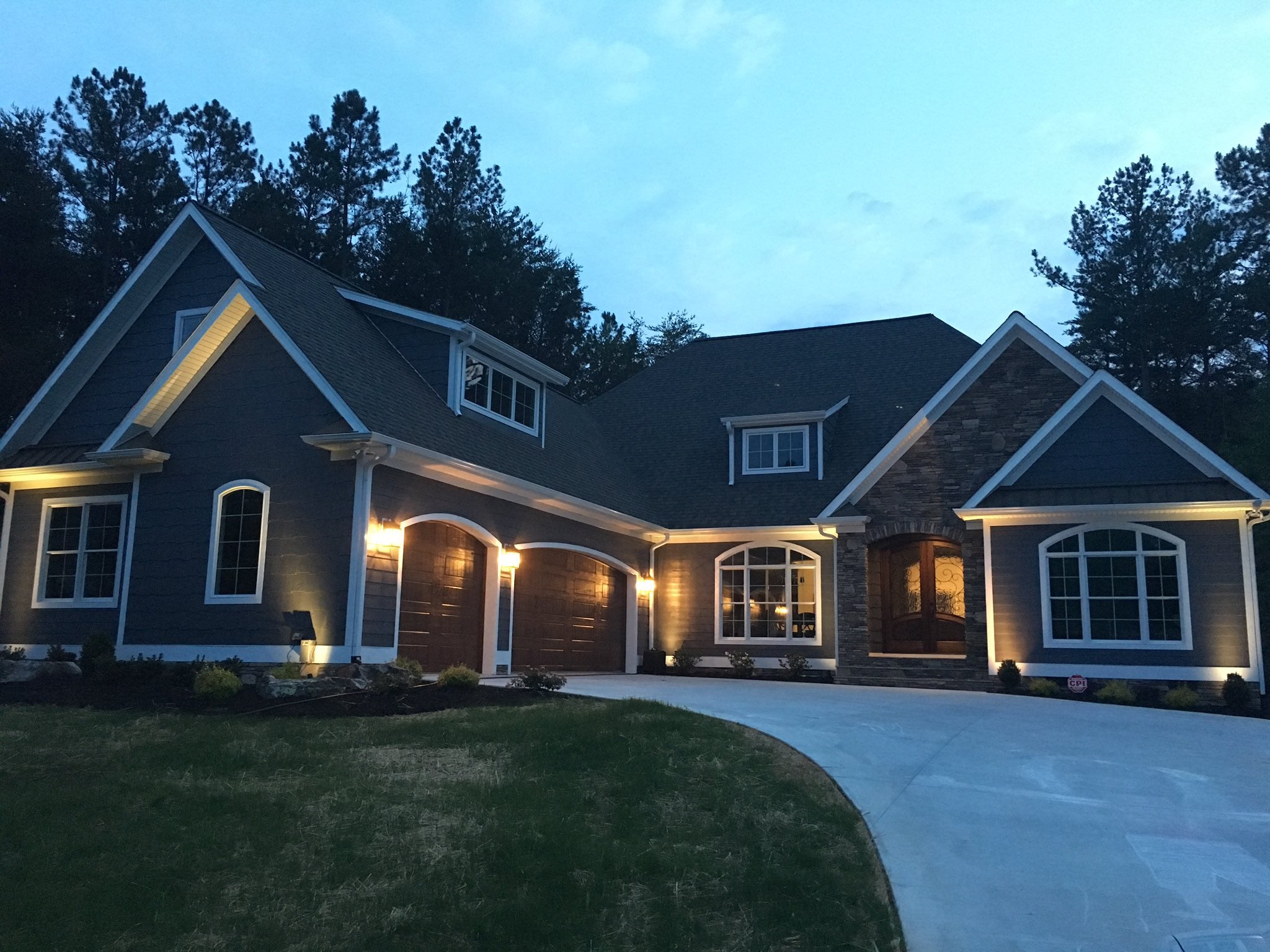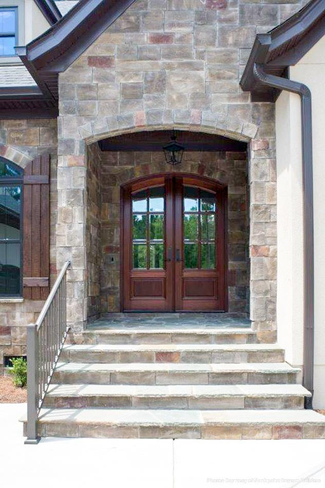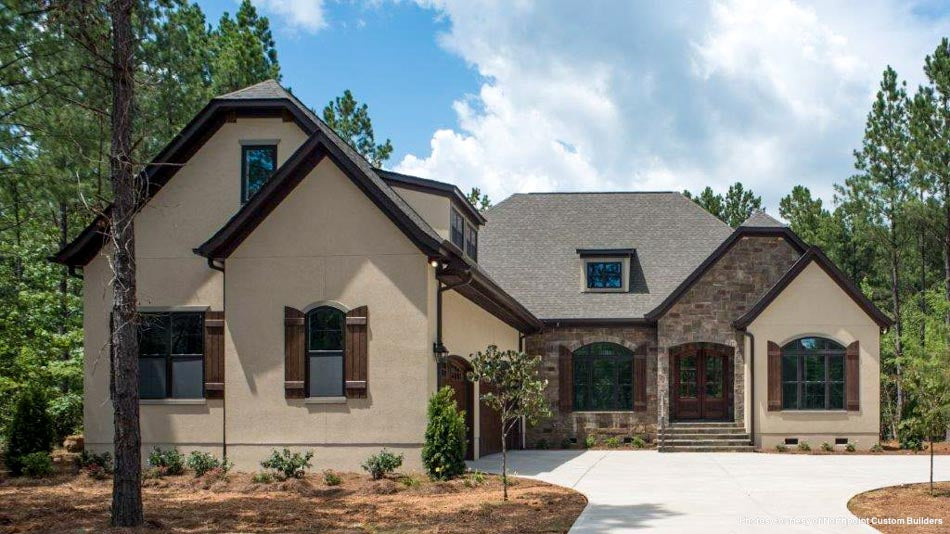 The home's exterior features a combination of brick and stone, arched windows and doors, and a courtyard-oriented 3-car garage, creating a welcoming and rustic curb appeal. The design emphasizes a connection to nature, making it perfect for various settings. -