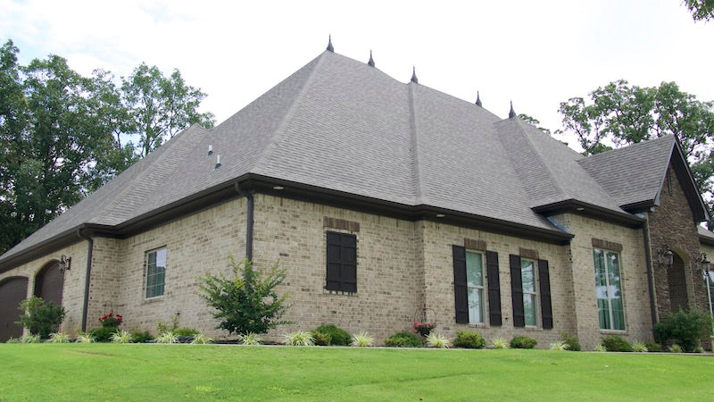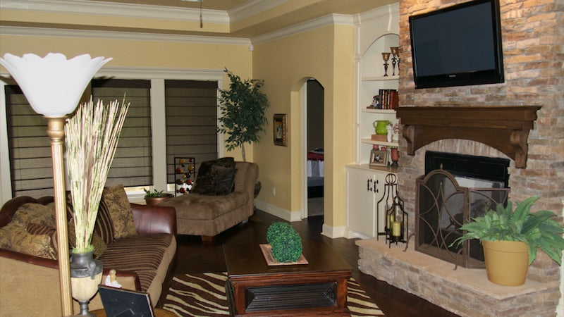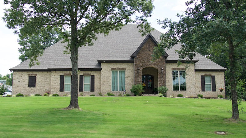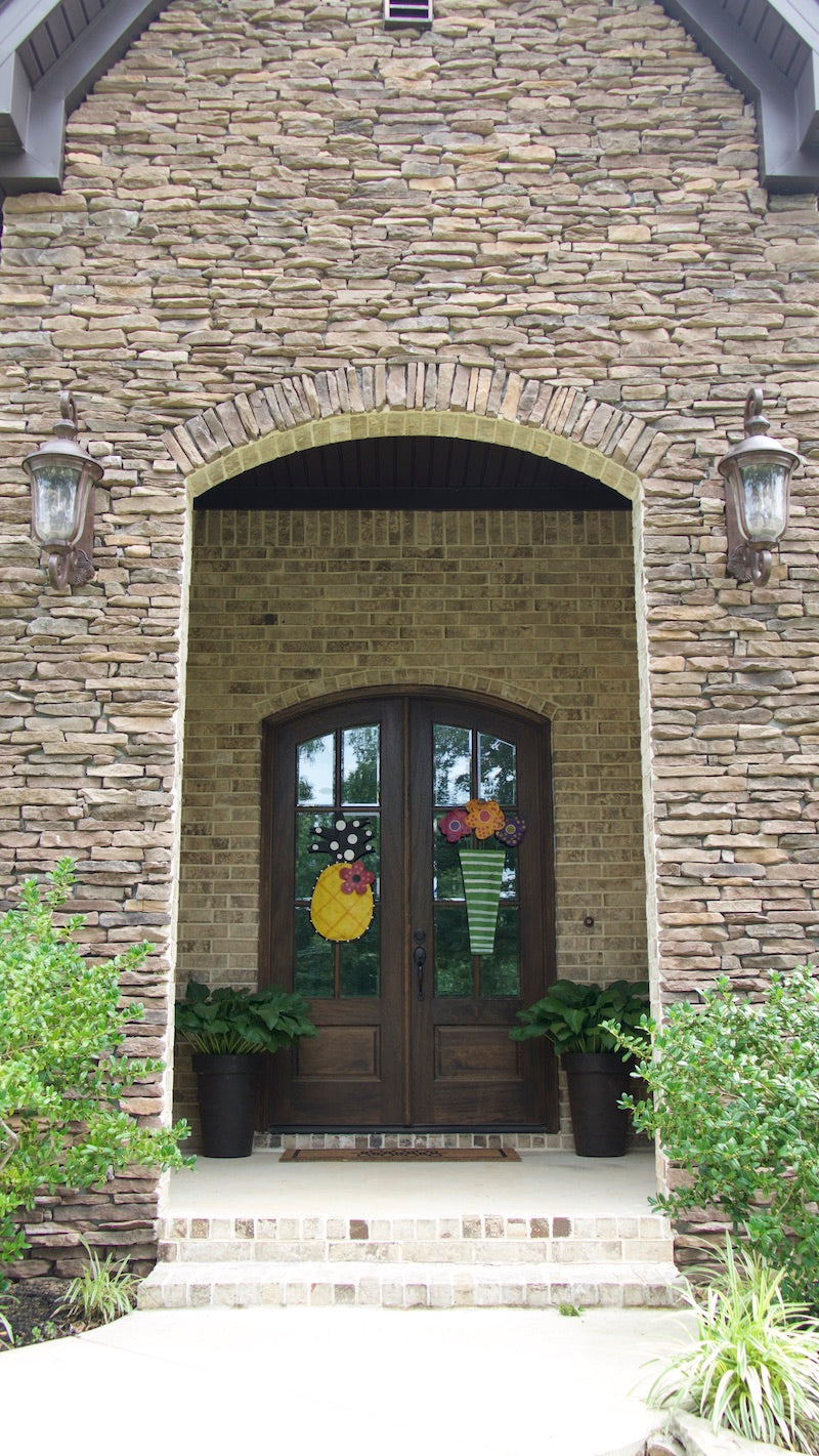 The home's exterior features a combination of stone and brick, creating a sophisticated curb appeal. The design emphasizes a connection to nature, making it perfect for various settings. -