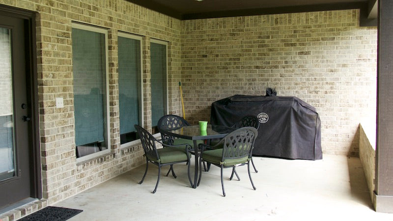 The covered rear porch provides a perfect spot for outdoor entertaining, featuring an outdoor fireplace and ample space for family and friends.