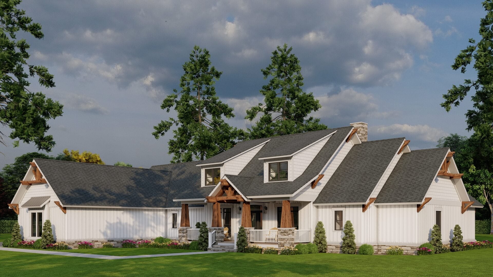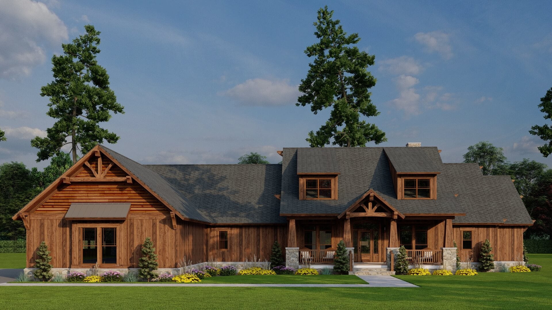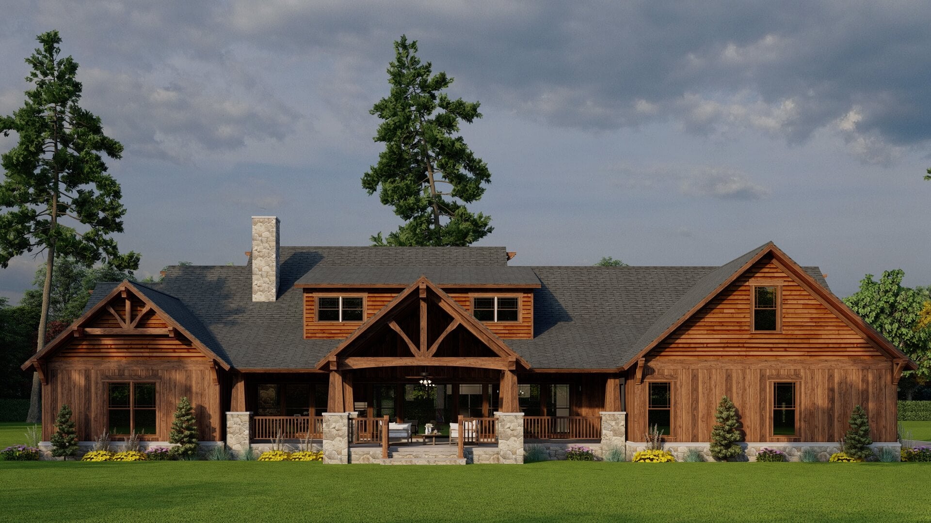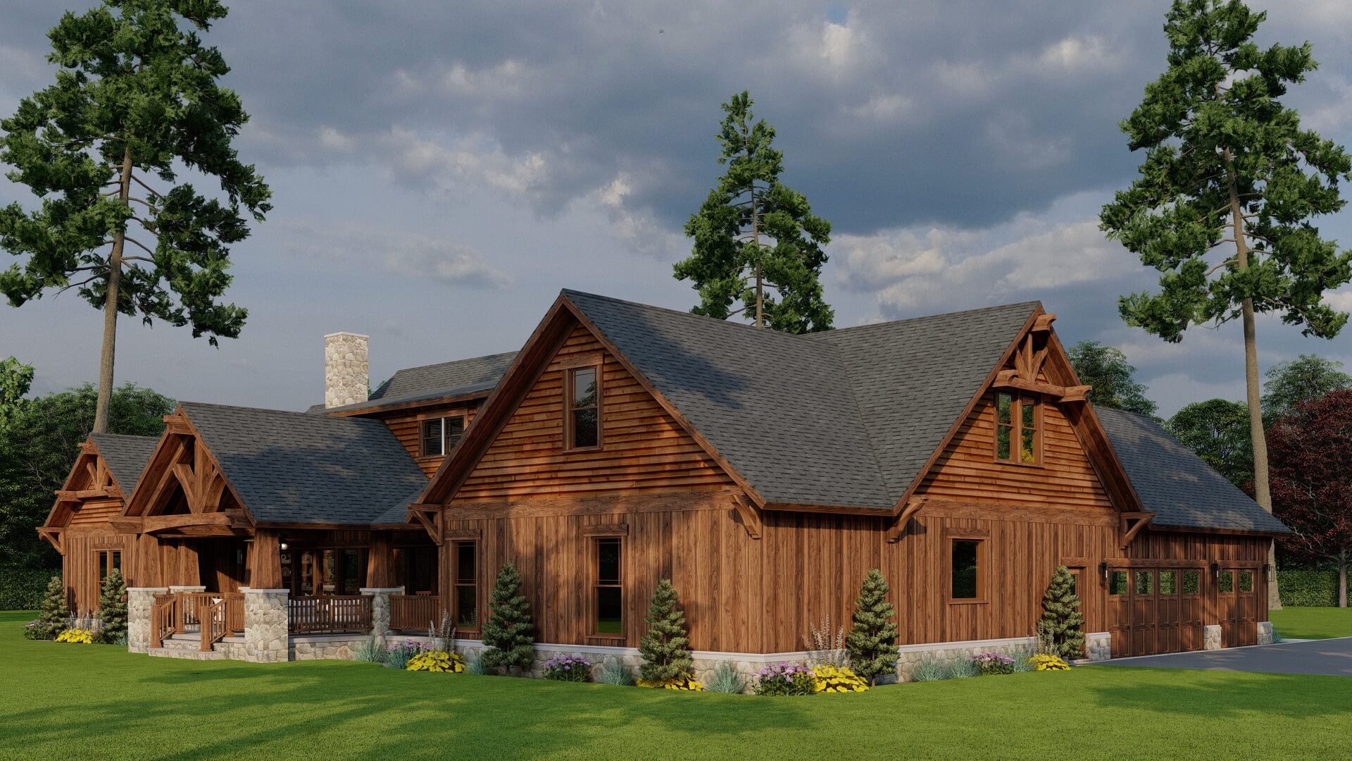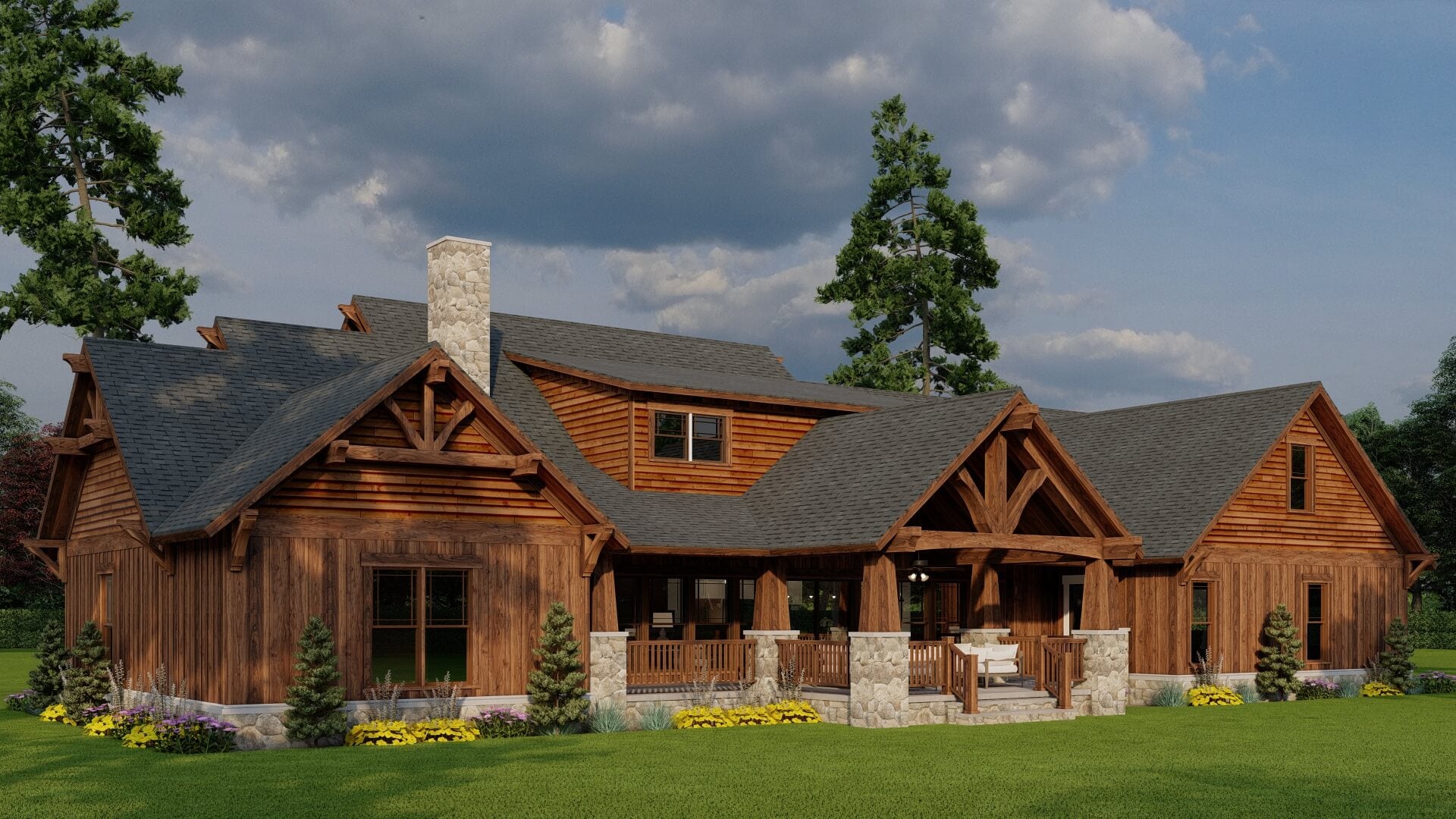 The exterior combines shake, siding, and stone elements, creating a relaxed yet bold style. A broad covered front porch sets the tone, inviting you to linger and enjoy the view. -