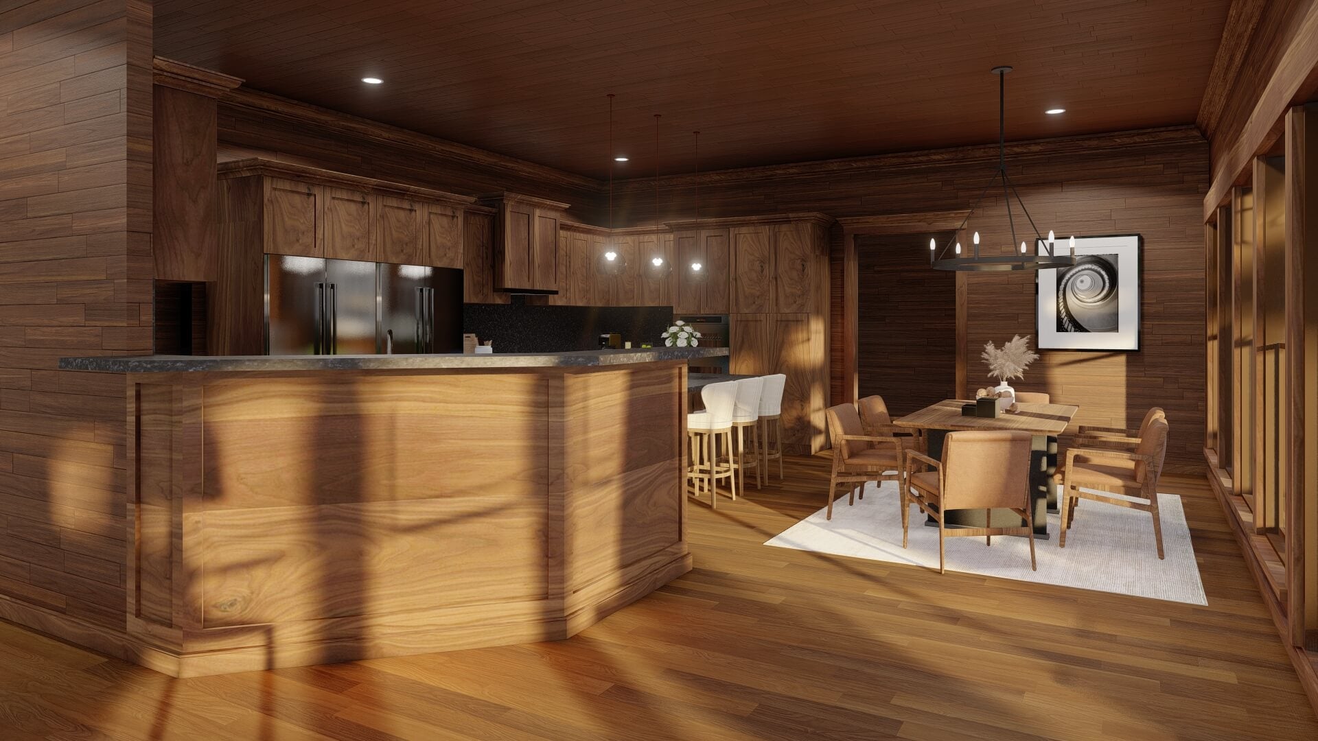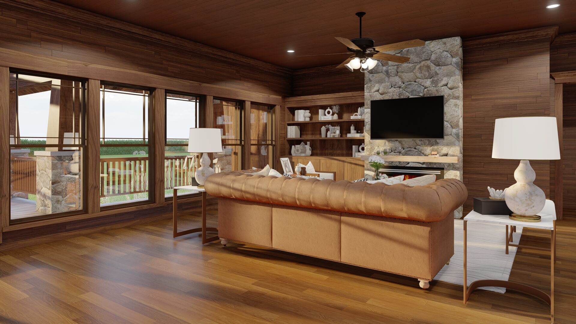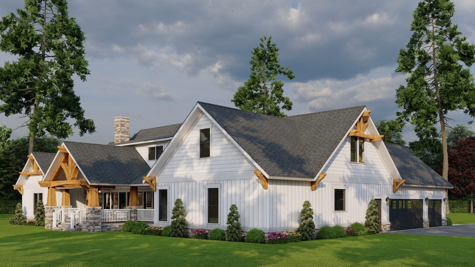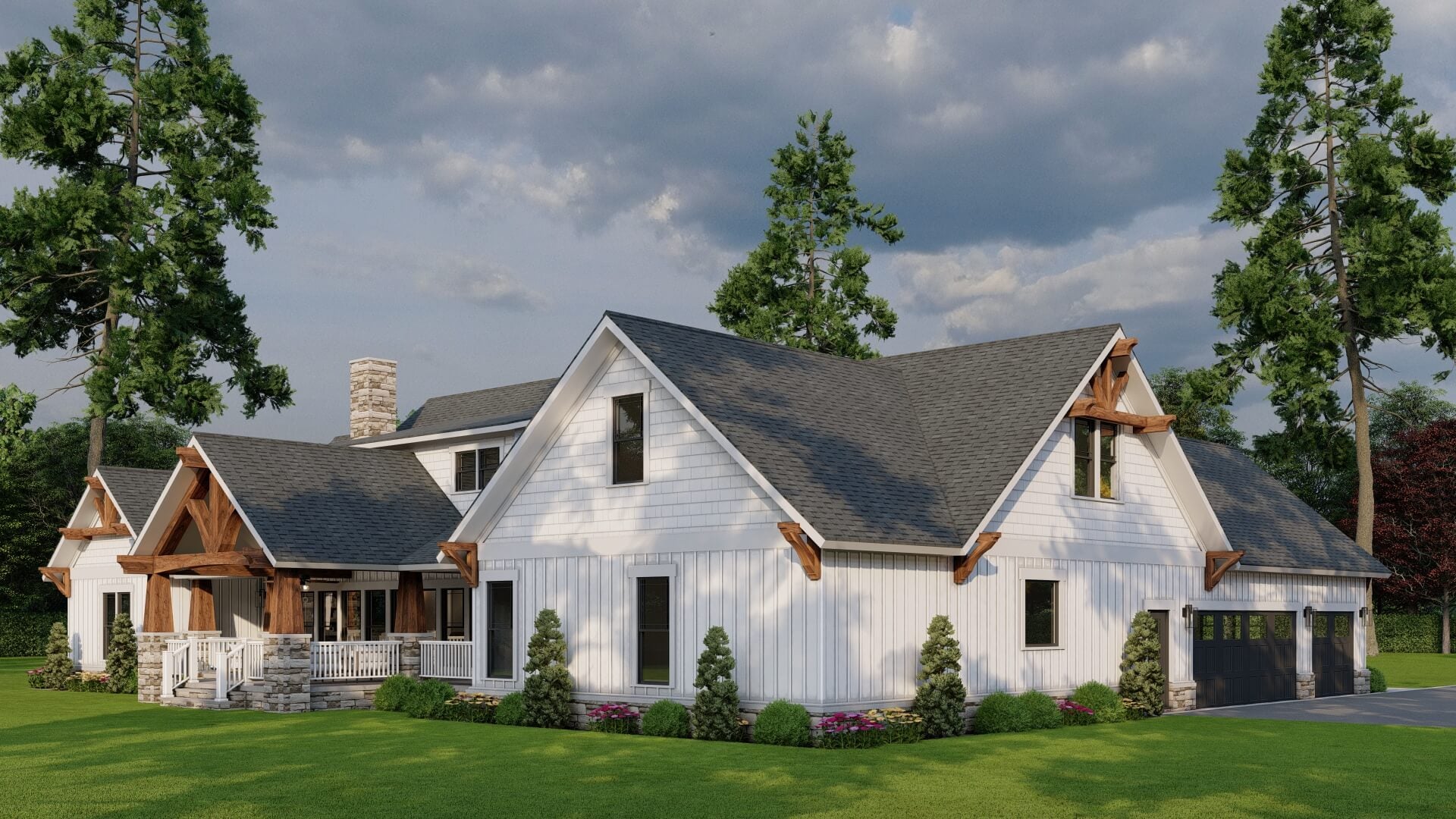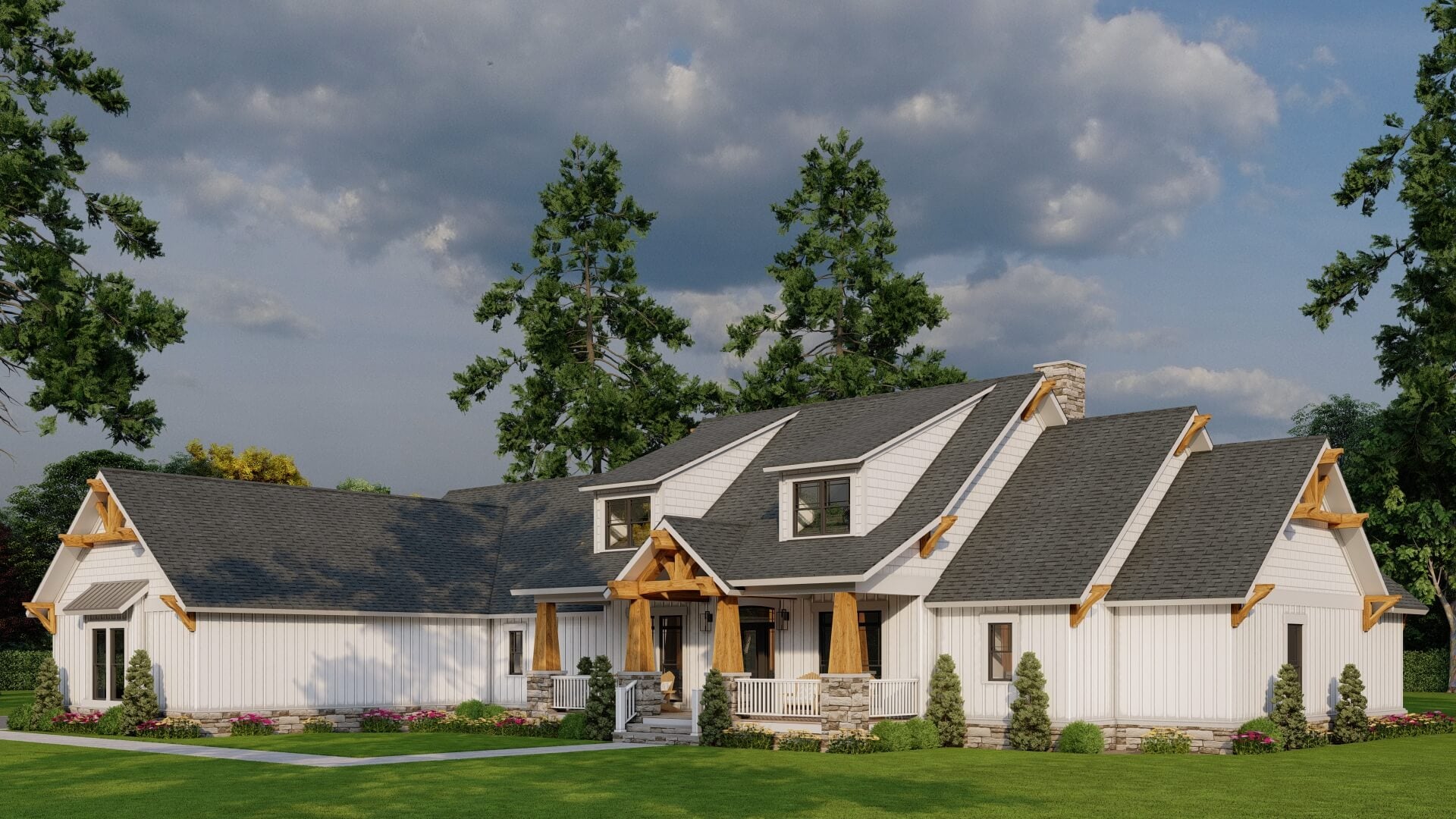 The exterior combines shake, siding, and stone elements, creating a relaxed yet bold style. A broad covered front porch sets the tone, inviting you to linger and enjoy the view. -