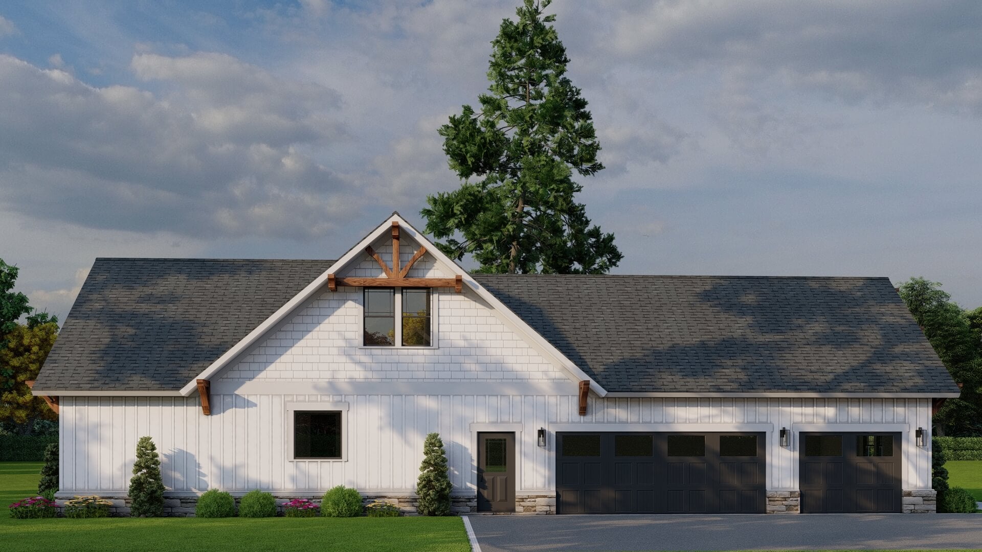 The design includes 4 bedrooms, 3 full baths, and 1 half bath. A three‑car side‑load garage, laundry room, and mechanical room complete the essential utility areas. -
