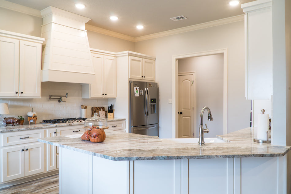 The heart of the home is an open layout where the great room flows into the kitchen and breakfast area. The space features exposed ceiling truss beams, two islands to maximize workspace, and a stone fireplace as a focal point. -
