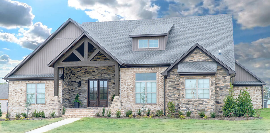 The façade showcases exposed truss beams, a generous front porch, and a mix of materials that create texture and curb appeal. Its Craftsman influence adds warmth and timeless style. -