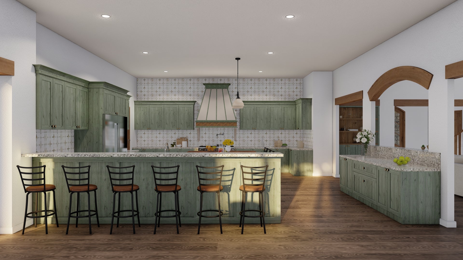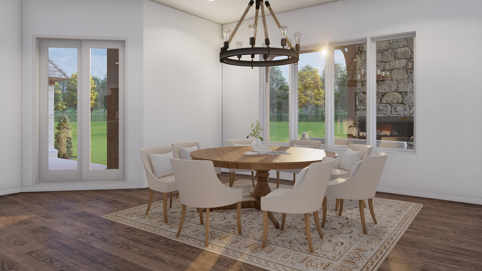 The kitchen is equipped for serious cooking—60" range with pot filler faucet, generous vent hood, large island, and easy sightlines to the outdoor living porch. The dining room sits adjacent, offering views of the backyard.
