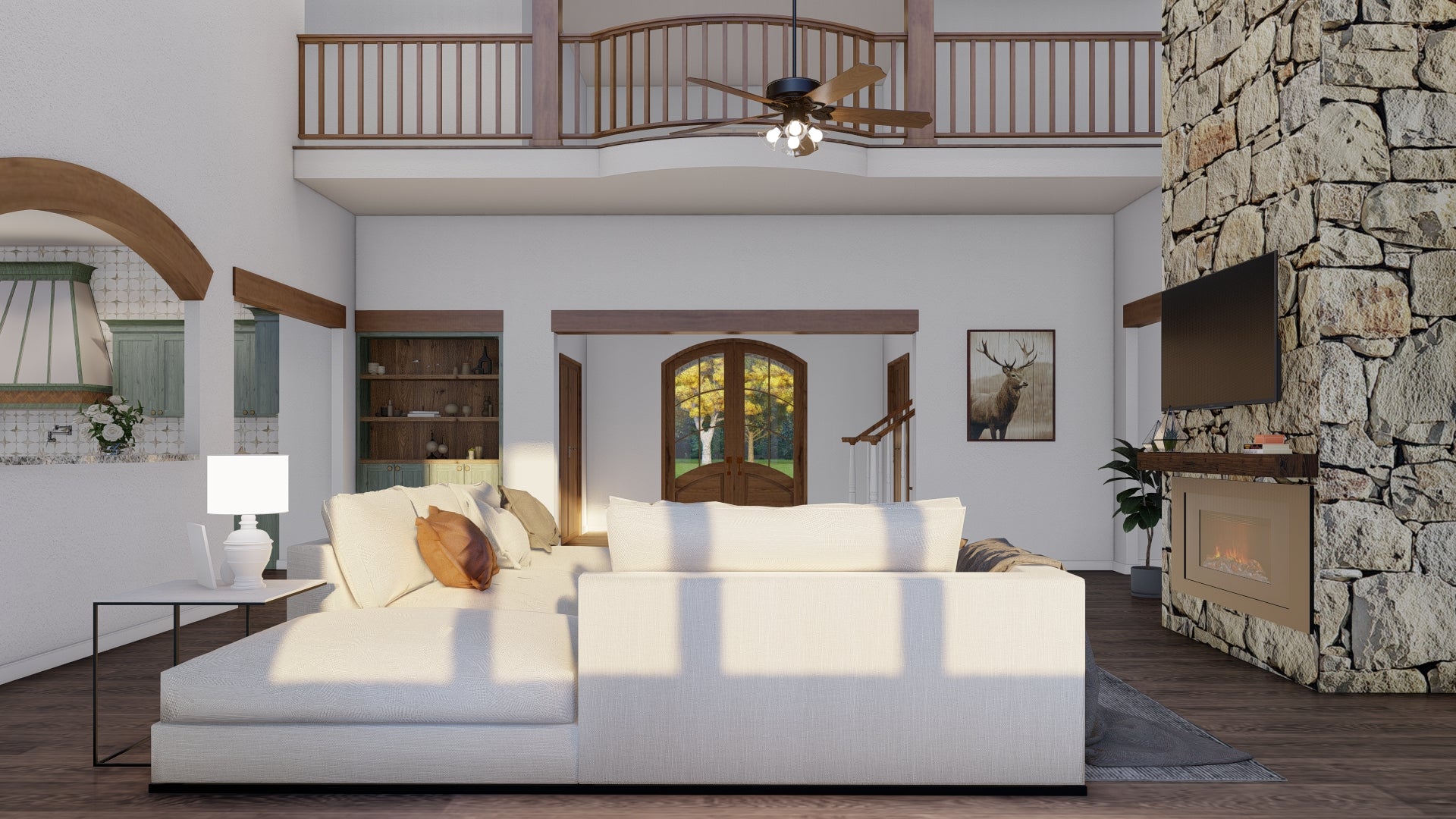 Grand rooflines, an arched entry, and a stately covered front porch create a strong first impression. Inside, a foyer leads your gaze upward to an open balcony above. French doors flank the foyer, giving access to a study on one side and a fitness room on the other. -