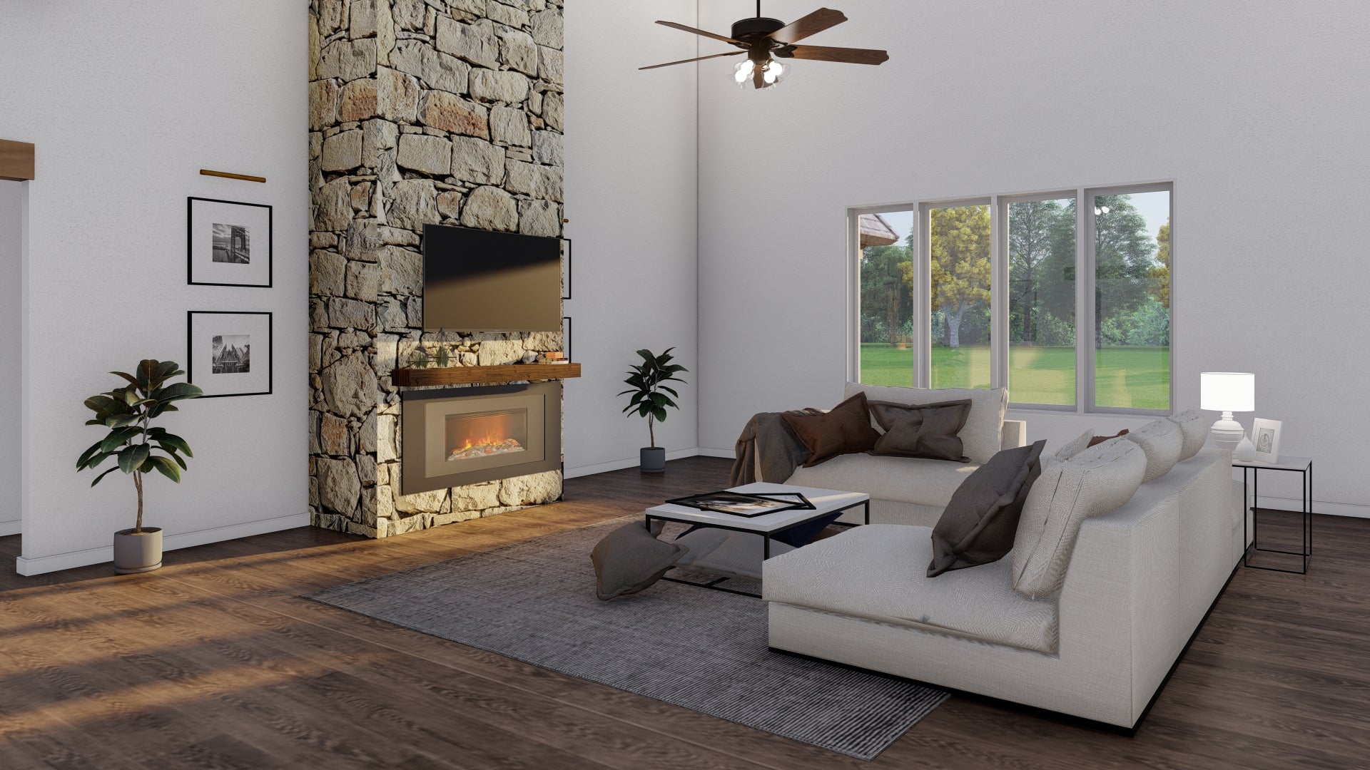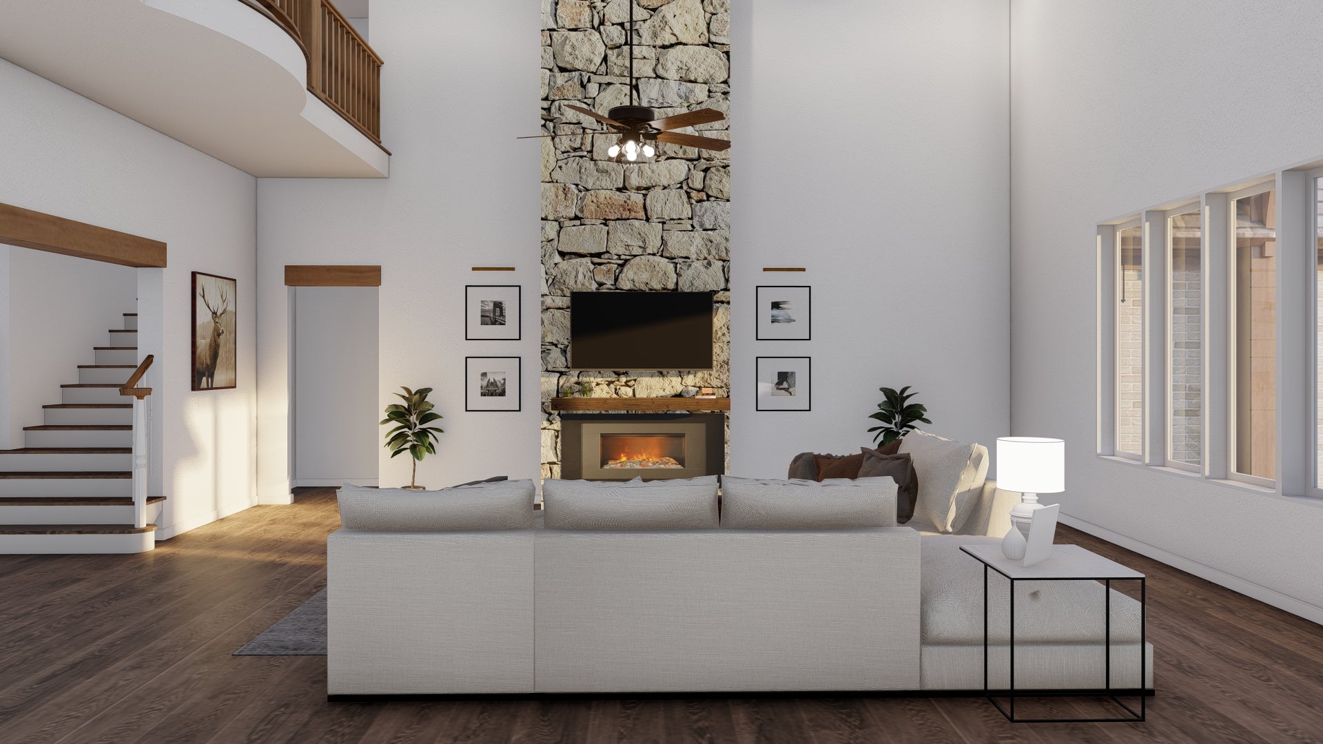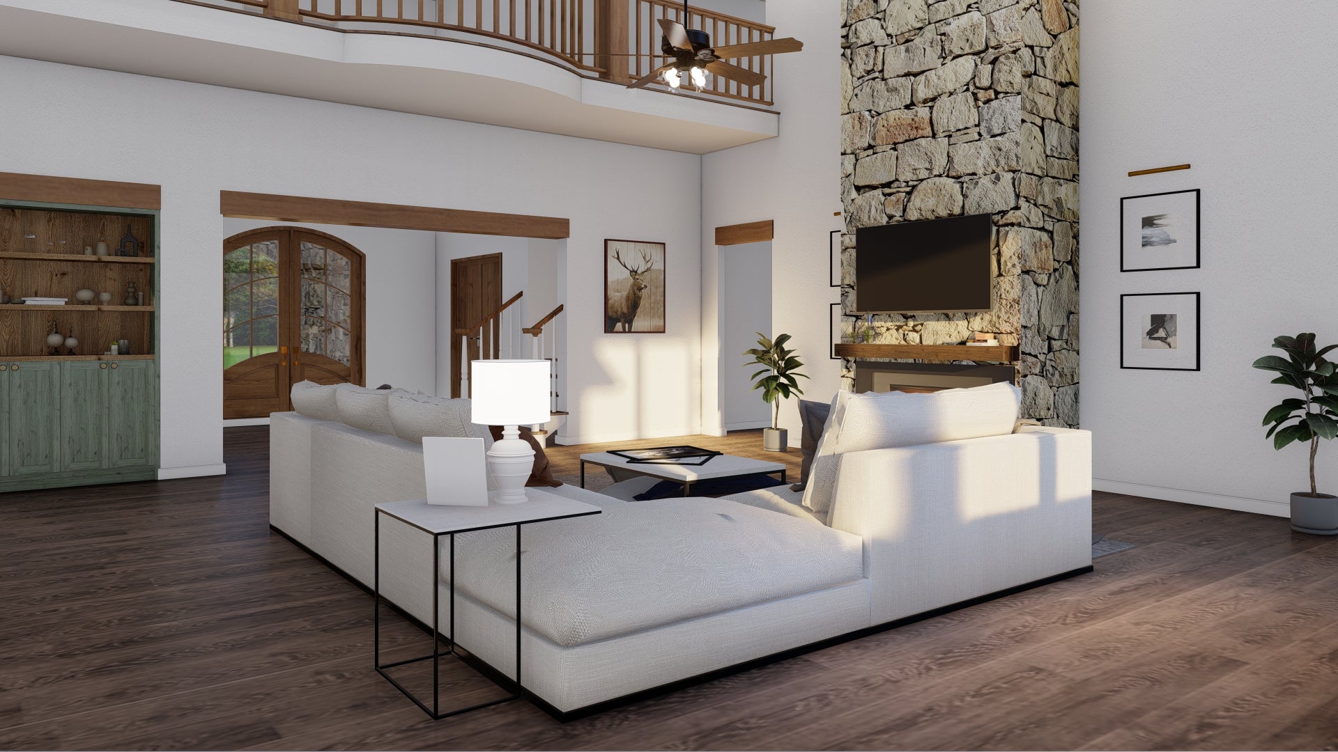 The great room features a fireplace and direct adjacency to formal living spaces and kitchen. Large windows and a vaulted ceiling heighten the sense of space and light. -