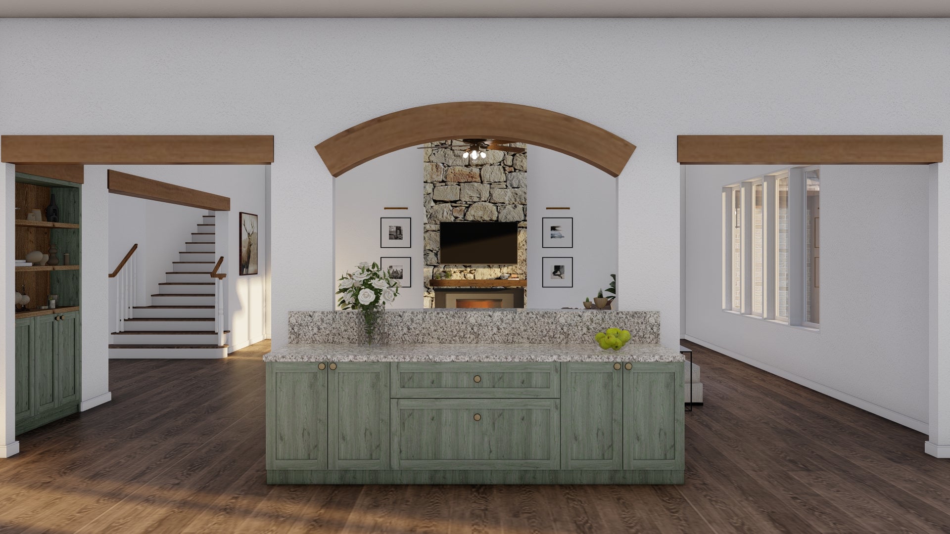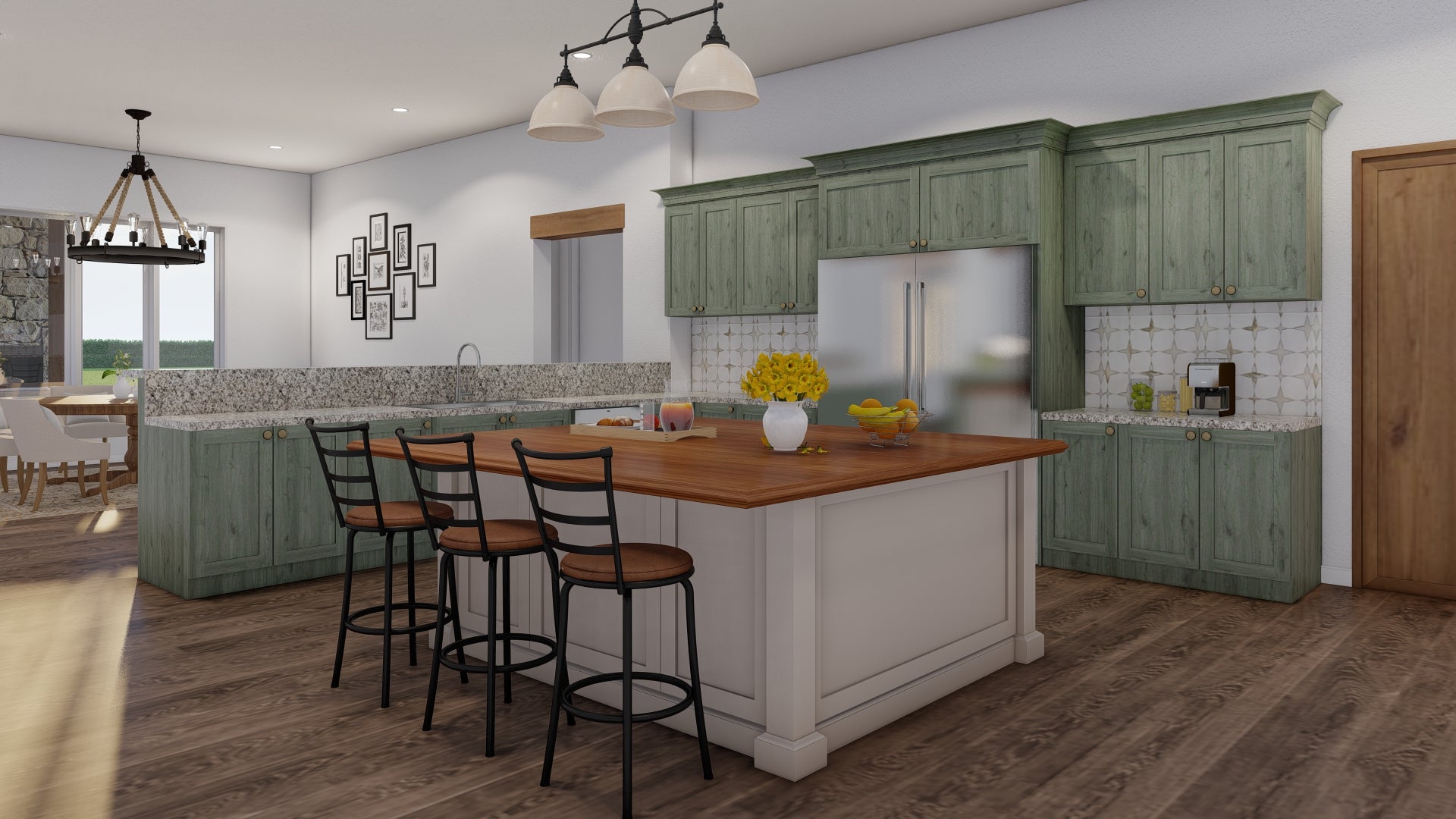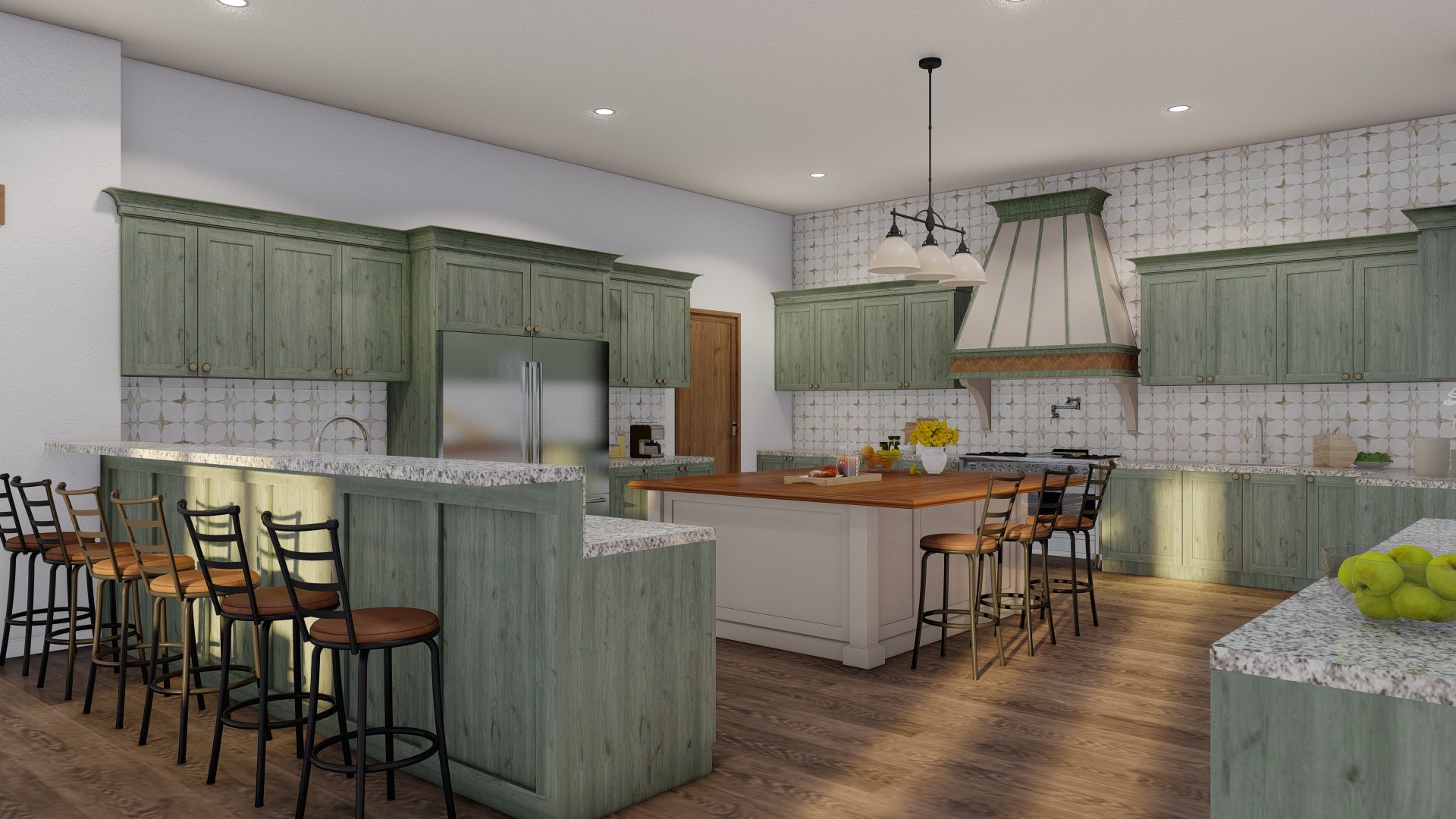 Behind the kitchen lies a large laundry room, a “hunting room” (flex space), and access to the garage area. -