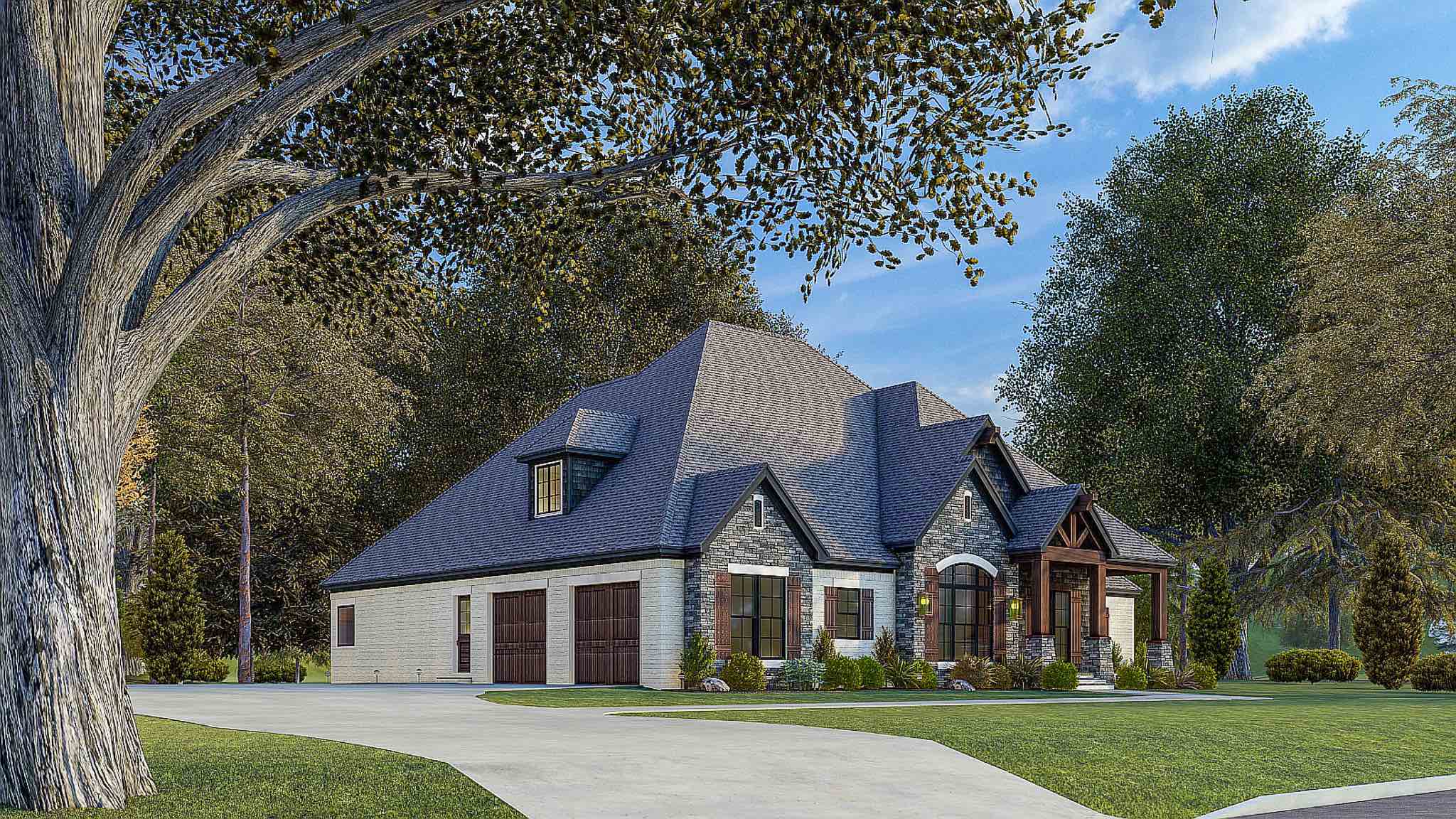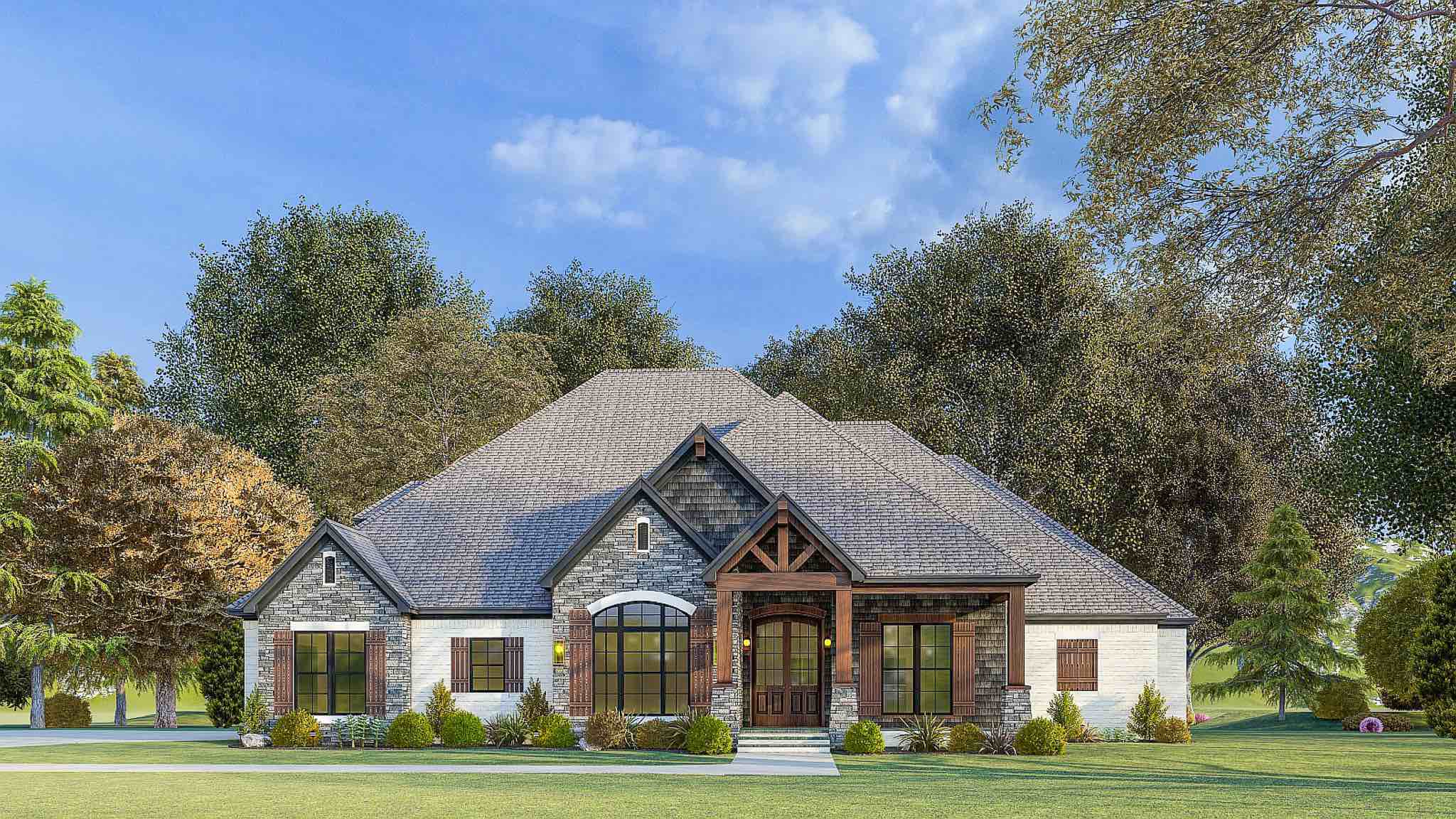 The exterior balances traditional rustic touches with a clean, modern palette. Crisp white brick combines with cool gray stone, and shake siding accents add warmth and depth. Stone‑based columns and exposed timbers echo classic rustic elements in a fresh way.