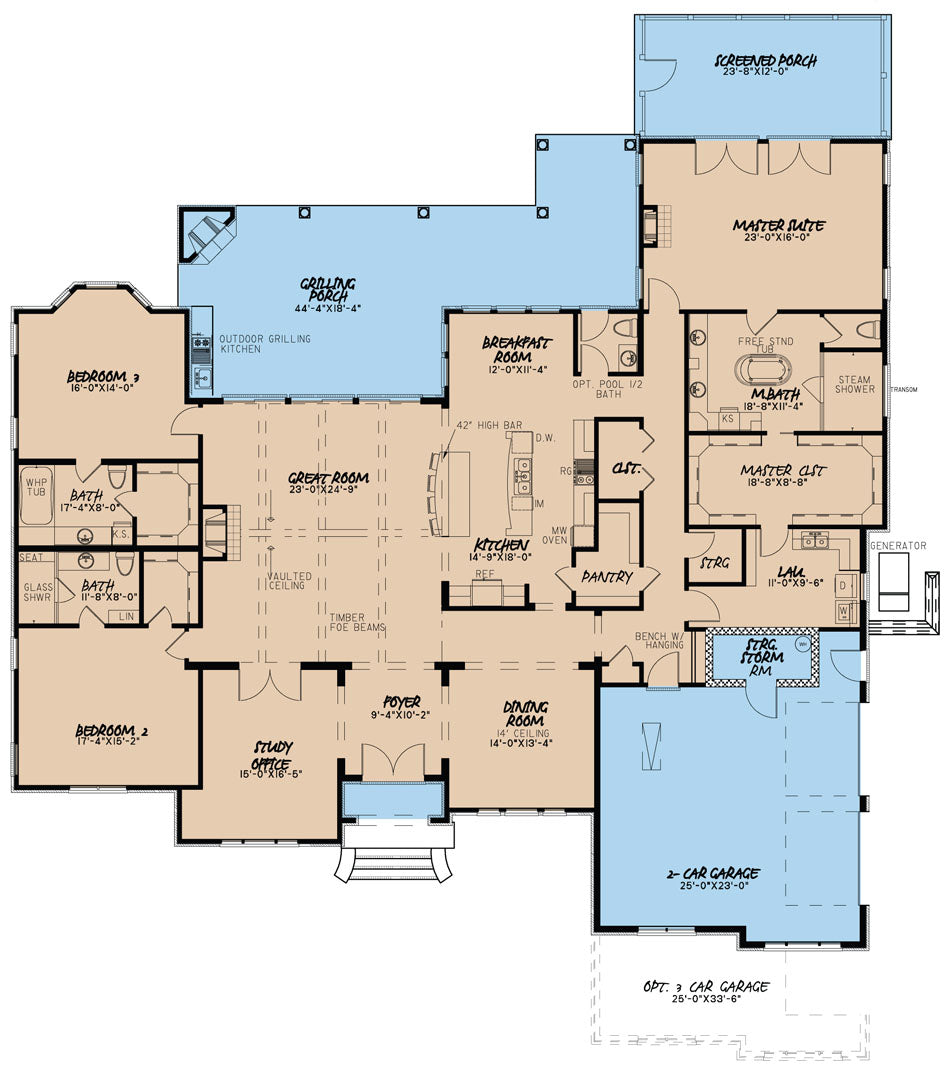 Upon entering, you're greeted by a foyer that leads to a study on the left and a formal dining room on the right. Straight ahead lies the spacious great room, which features a vaulted ceiling with exposed timber beams and a cozy fireplace, perfect for relaxing evenings. -