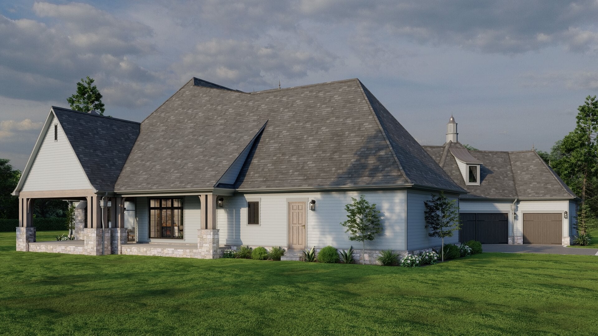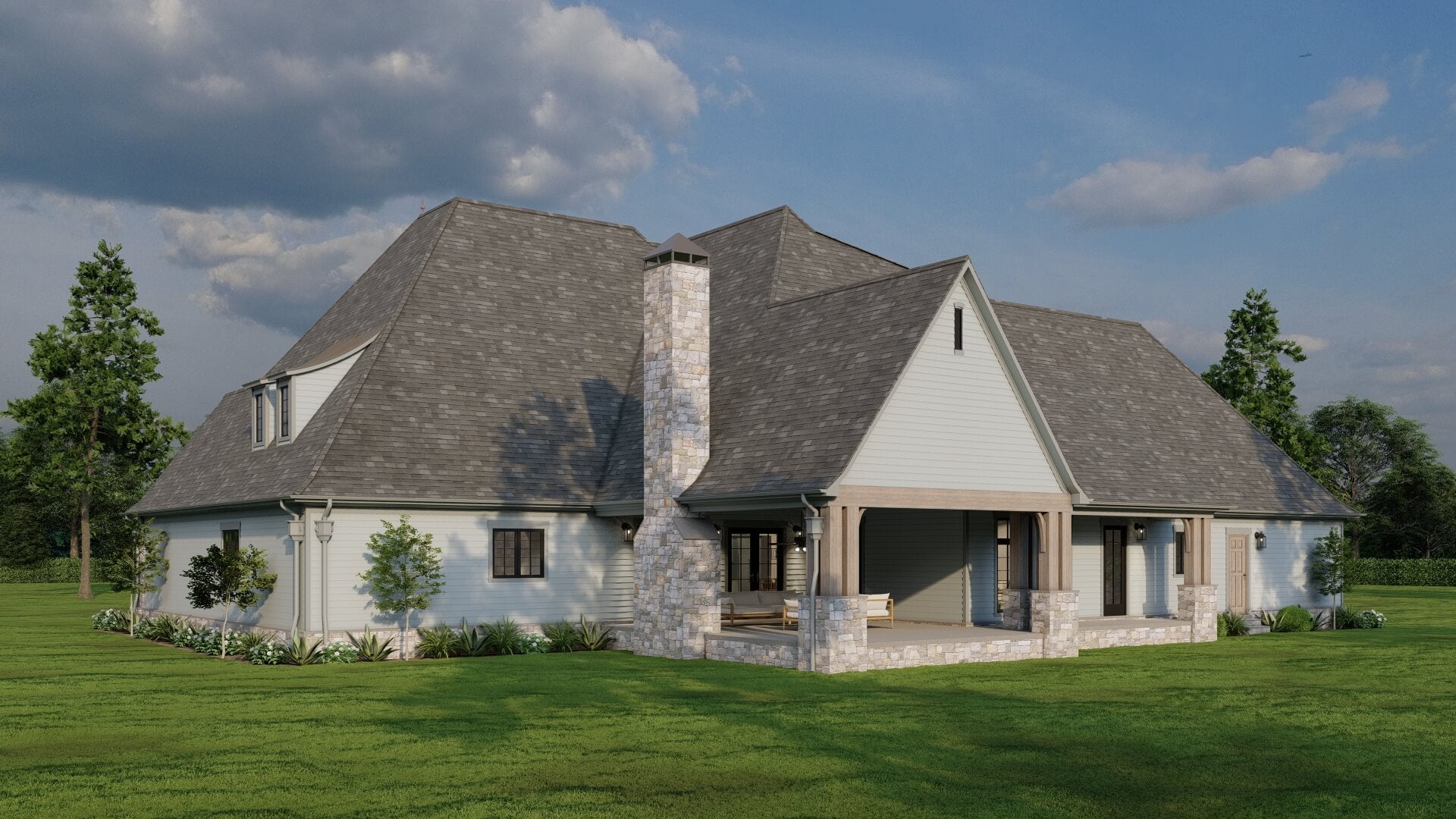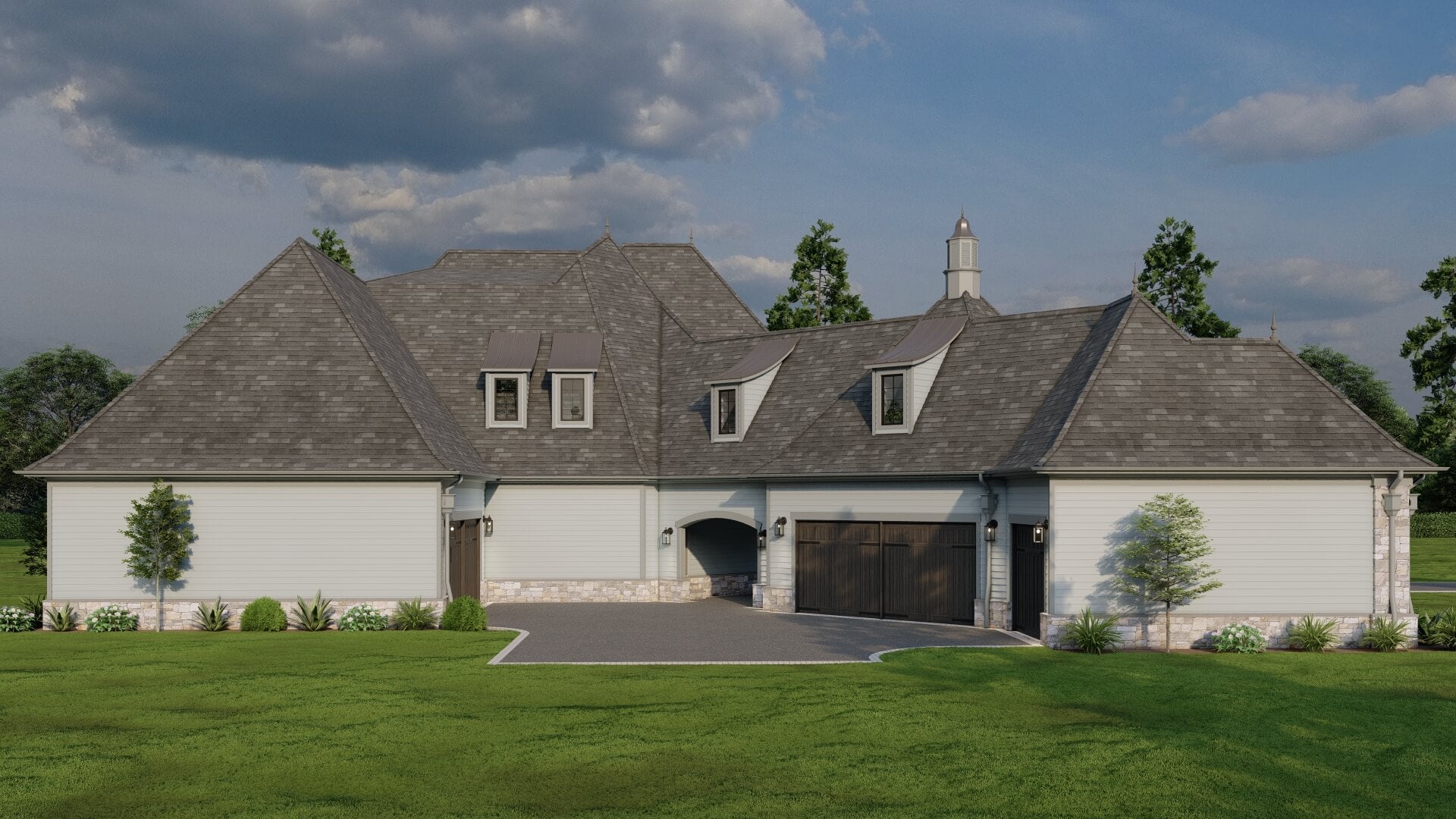 St. Clair encompasses approximately 6,356 square feet of heated living space, featuring 5 bedrooms, 5 full baths, and 1 half bath. The home also includes a 5-bay angled garage and a porte cochère, providing ample parking and a grand entrance. -