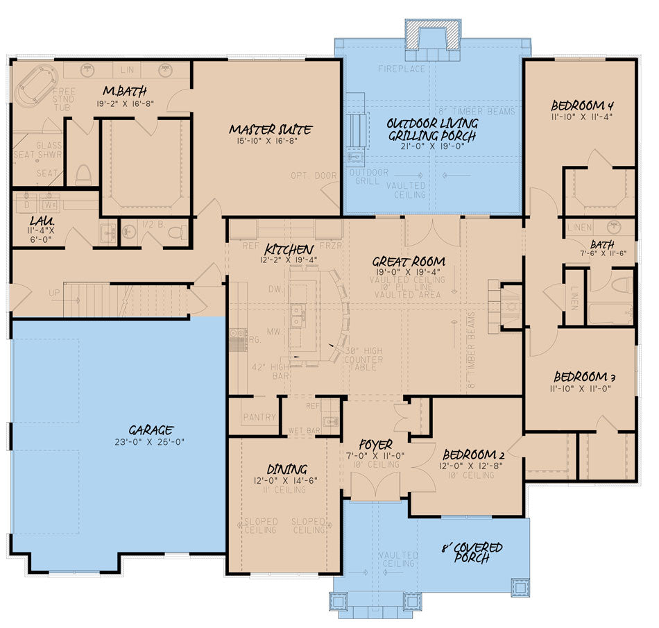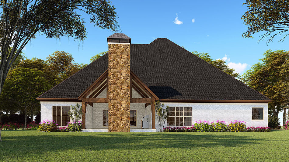 The home emphasizes outdoor living with a covered rear porch that includes a grilling area, perfect for entertaining or enjoying meals al fresco. The porch features a vaulted ceiling with exposed timber beams and a large masonry fireplace, providing a cozy space to relax even on chilly evenings. -