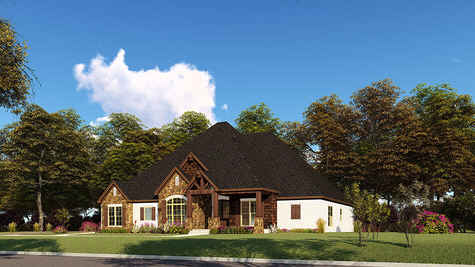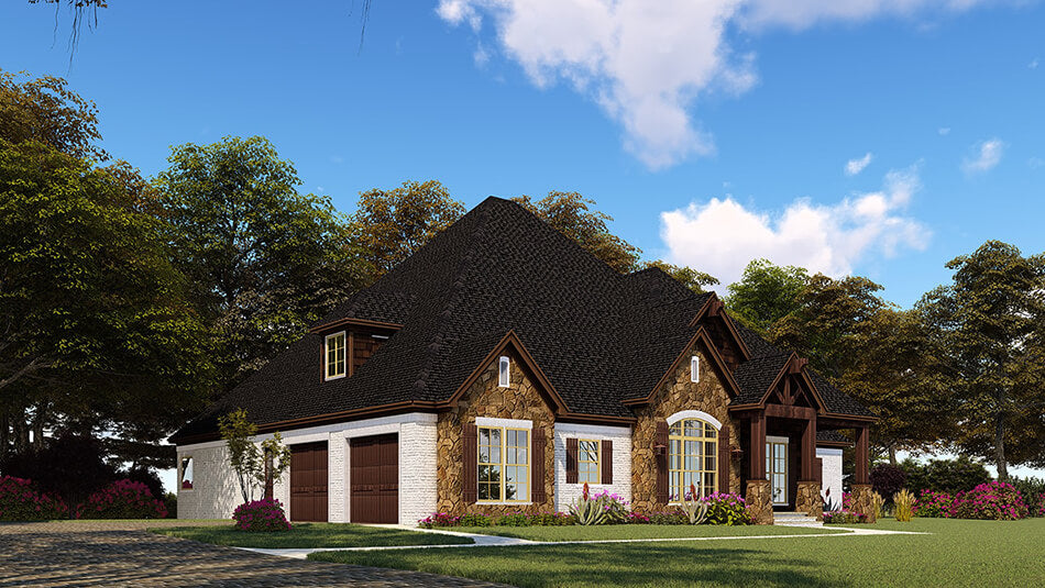 If you're exploring house plans that offer a harmonious blend of rustic charm and modern functionality, The Rockford Place Plan MEN 5057 is a standout option. Designed by Michael E. Nelson, this single-story home boasts over 2,500 square feet of living space, featuring 4 bedrooms, 3 full baths, and 1 half bath. The home also includes a 2-bay side-load garage and a bonus room above the garage, providing ample space for storage or additional living areas.