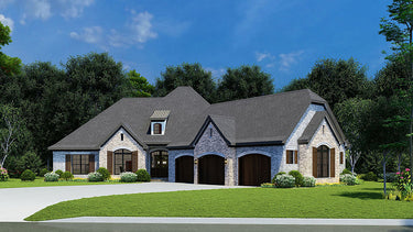 The façade blends brick and stone with traditional shutters and elegant garage doors. Its combination of classic materials gives it a timeless appeal in the world of house plans. -