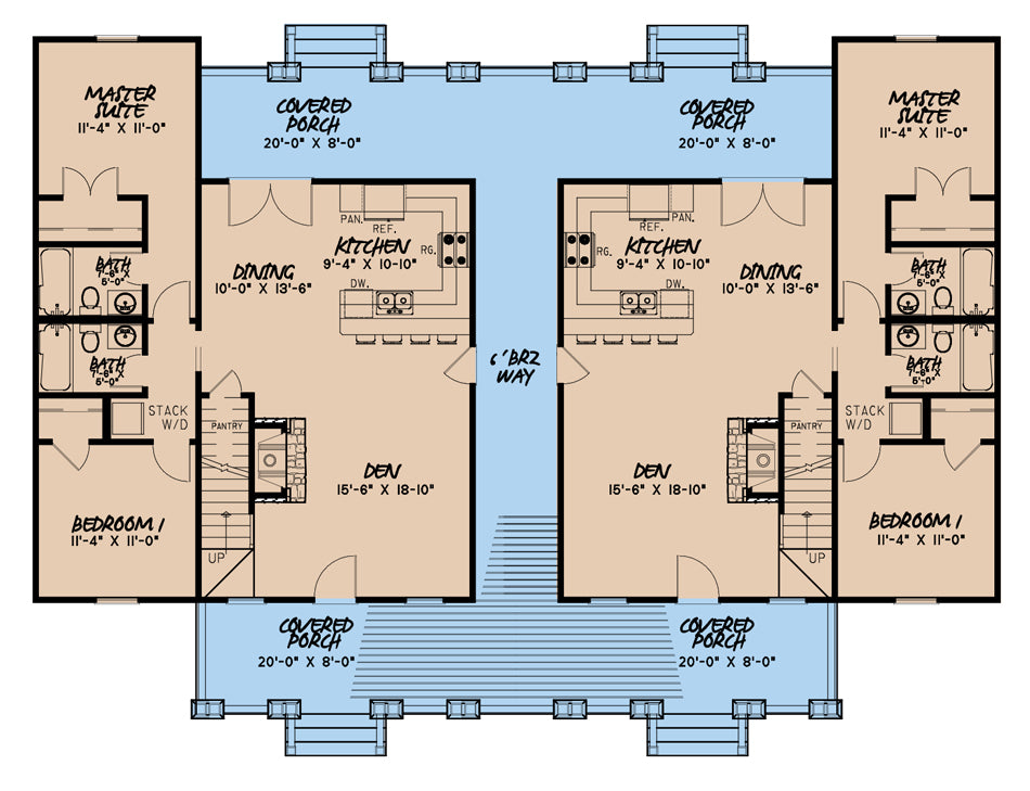 These duplexes are the mirror duplicates of one another and a separated by a 6’ breezeway