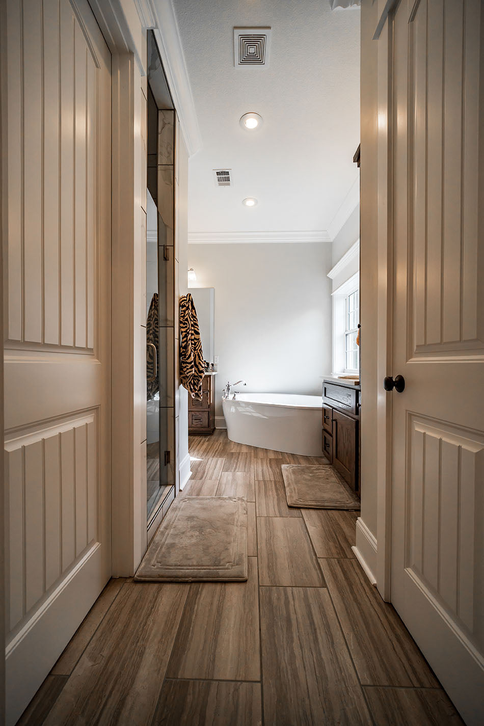 - Elegant master suite: Designed for privacy and indulgence, the master wing features porch access, a freestanding tub, dual vanities, and a large walk-in closet with a central island.