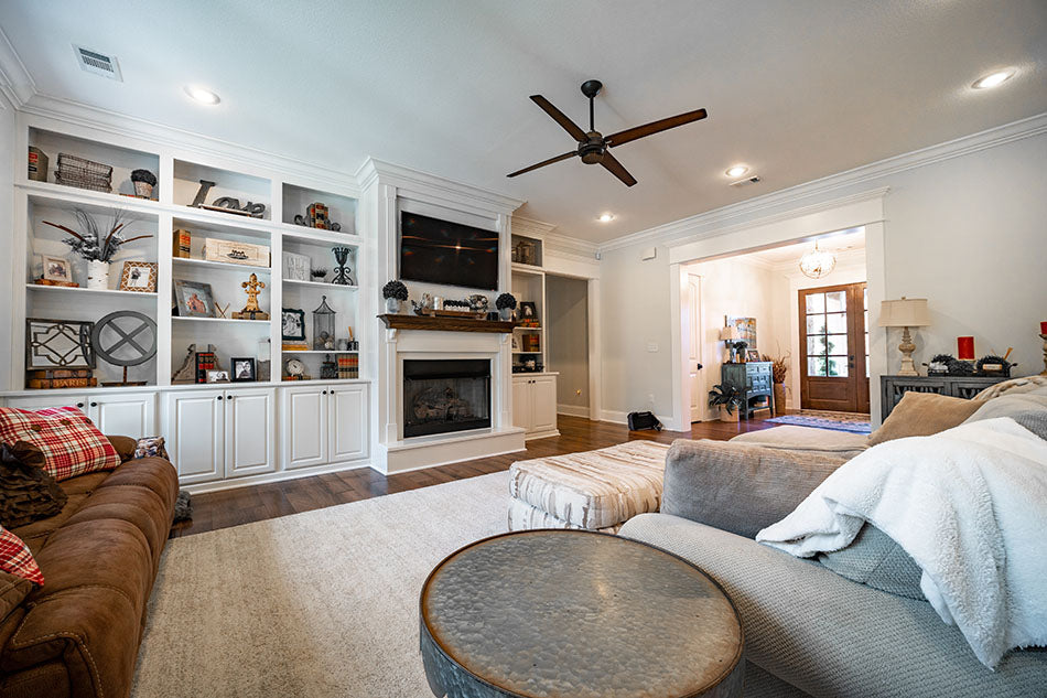 - Spacious layout: With 4,575 sq. ft., this plan includes 4 bedrooms, 4.5 bathrooms, a large open-concept kitchen with double islands, and a cozy great room with fireplace.