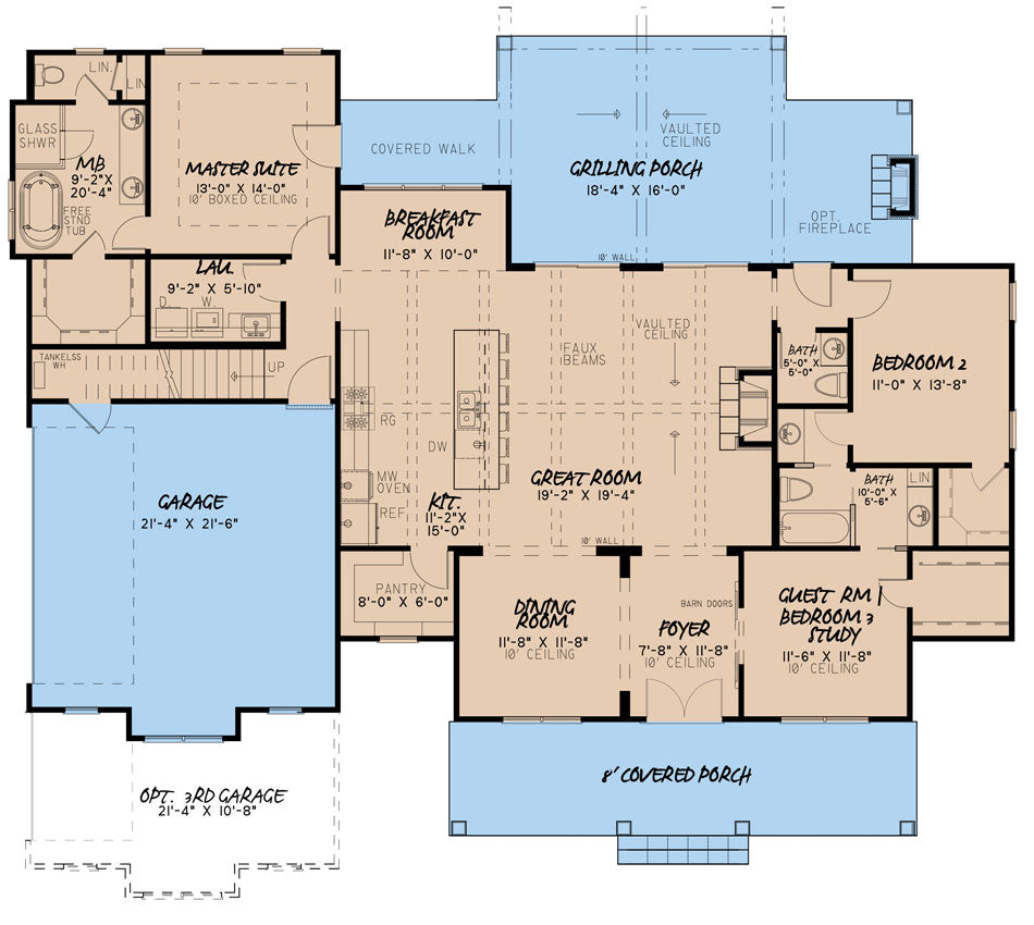 - Private Master Suite: The master bedroom offers 10-foot boxed ceilings and two windows facing the rear of the home. A private entrance leads to the covered walk and grilling porch, ideal for outdoor relaxation.