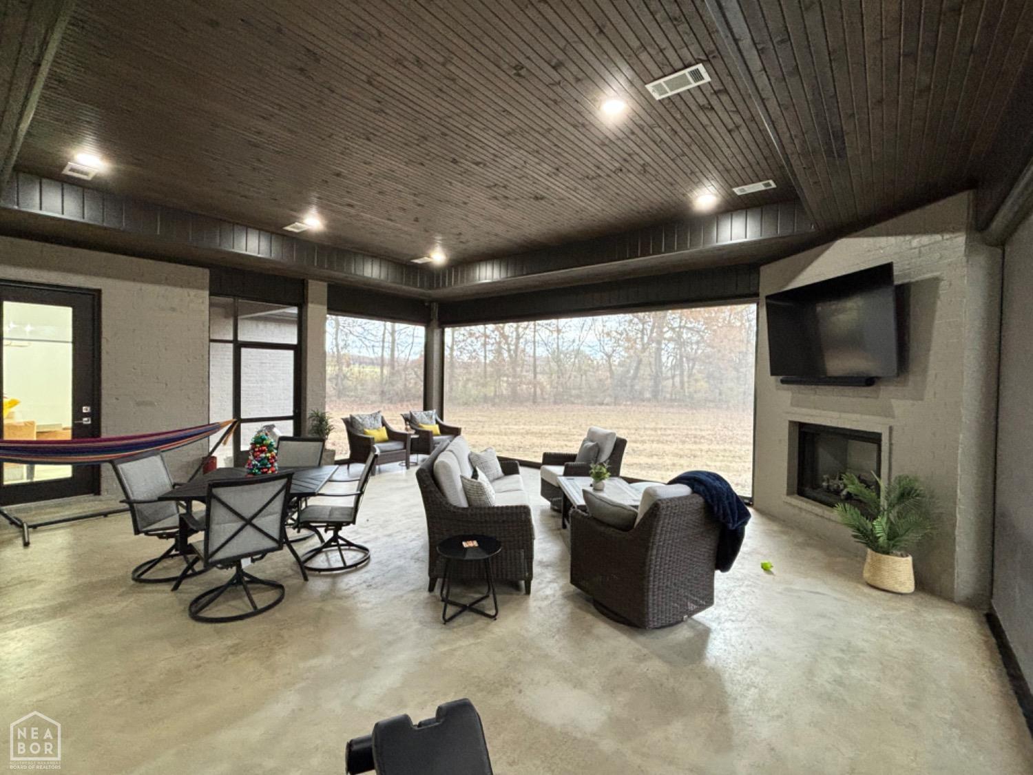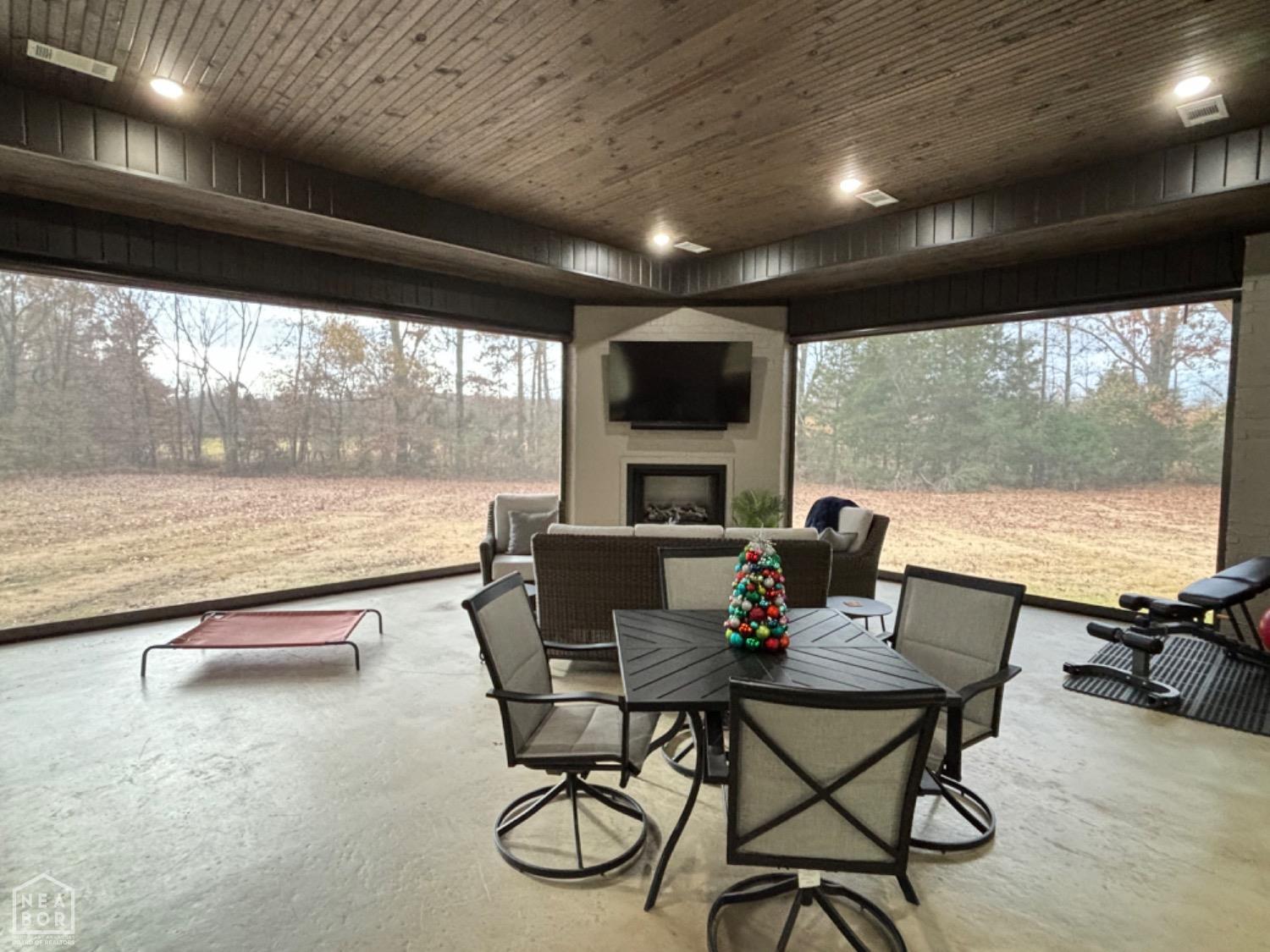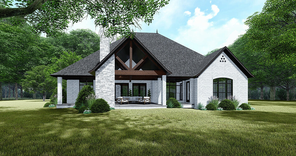 - Outdoor Living: The outdoor living area/grilling porch is divided into three parts: a covered central area with timber beams and a large outdoor fireplace, and two uncovered sections perfect for grilling or entertaining on sunny days.