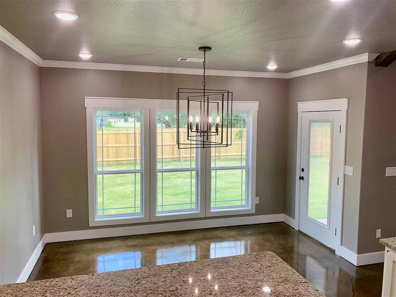 - Dining space with light: The dining area includes a wall of windows facing the backyard and easy access to a covered grilling porch, making it ideal for indoor–outdoor entertaining.