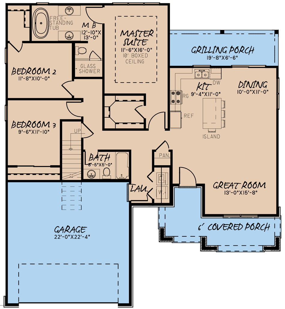 - Master Suite: Includes a 10-foot boxed ceiling, triple transom window, walk-in closet, dual vanities, a freestanding tub, and a corner glass shower.