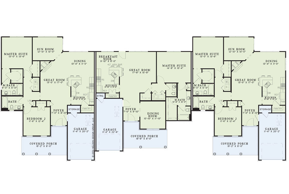 On each end of the triplex, sunrooms off the dining areas offer extra living space and natural light, enhancing both functionality and aesthetic value.