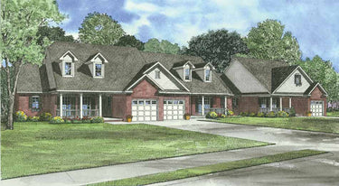 This plan includes three side-by-side units, each designed with a welcoming front porch, classic columns, and a cohesive traditional aesthetic—perfect for neighborhood development or rental communities. -